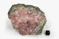 Коллекция Систематическая коллекция, №89205. Темно-розовый грубозернистый с скорлуповато-мозаичной спайностью в неправильной полости в измененном стекловатом андезите. Длина экспоната 10 см.