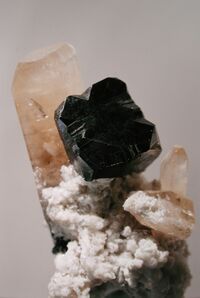 Коллекция Систематическая коллекция, №89227. Черный кристалл 0.8см кубического габитуса с гранями тетрагонтриоктаэдра, формирующими "зазубрины" на ребрах куба. Hарастает на розовато-коричневый столбчатый кристалл топаза из пустоты в риолите. Длина экспоната 3.0 см.Размер минерала 0.80 см.