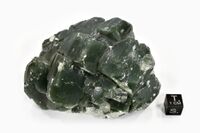 Коллекция Систематическая коллекция, №89250. Сросток мозаичных кристаллов с искривленными гранями, темно-зеленого цвета из-за включений актинолита Длина экспоната 9 см.