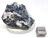 Коллекция Систематическая коллекция, №89273. Черные призматические зерна до 1см в кальцитовом агрегате с гематитом. Длина экспоната 5.0 см.Размер минерала 1.00 см.
