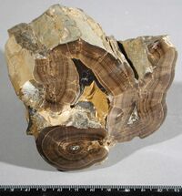Коллекция Систематическая коллекция, №89394. Сферолитового строения темно-коричневые псевдосталактиты ("oakstone") с лимонитом. Приполированный срез. Длина экспоната 11.5 см.