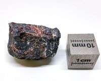 Коллекция Систематическая коллекция, №89428. В образце 3х2х2х см красные прозрачные пластиночки дефернита, бесцветные очень мелкие кристаллыки джаффеита, белые с зеленоватым оттенком волокнистый гиллебрандит. Все это в томнокоричневом гаусманите. Длина экспоната 3.0 см.