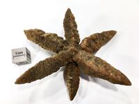 Коллекция Систематическая коллекция, №89752. Псевдоморфоза кальцита по икаиту. Тройник коричневых пористых копьевидных кристаллов до 5см. Длина экспоната 10 см.Размер минерала 5.00 см.
