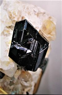 Коллекция Систематическая коллекция, №89806. Крупный 4х2.5х2см с красноватыми рефлексами сдвойникованный кристалл рутила, ограненный призмами {100} и {110} и дипирамидами {101} и {111}. А также несколько кристаллов меньшего размера в кварцевой щетке. Длина экспоната 11.0 см.Размер минерала 4.00 см.