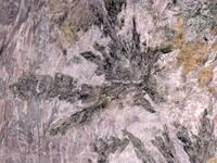 Коллекция Систематическая коллекция, №89862. Коричневато-серые дендритовые пучки франкаменита до 10см в сиреневом плойчатом чароите с тинакситом и эгирином. Длина экспоната 30 см.Размер минерала 10 см.
