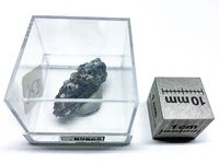 Коллекция Систематическая коллекция, №89865. Черные призматически-дипирамидальные кристаллы (до 0.8мм) с металловидным блеском в полостях в натролите. Пучки блестящих кристаллов до 1.5мм - баотит. С эгирином. Длина экспоната 2.0 см.Размер минерала 0.08 см.