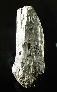 Коллекция Систематическая коллекция, №89884. Фрагмент (спайный выкол) крупного кристалла 8х2.5см с обособлениями сложенными теннантитом, жозеитом, эмпресситом, сильванитом. Аналитическая информация в прилагаемом конверте. Длина экспоната 8.0 см.