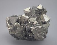 Коллекция Систематическая коллекция, №89907. Друза октаэдрических кристаллов пирита до 2см с присыпками кварца и сульфосолей. Длина экспоната 11.0 см.