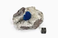 Коллекция Систематическая коллекция, №89918. Ярко синий сферолит размером 2см на щетке бесцветных кристаллов стильбита: инкрустирующих полость миндалины в измененном базальте. Длина экспоната 8.0 см.Размер минерала 2.00 см.