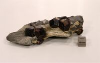 Коллекция Систематическая коллекция, №90004. Темнокрасные ромбододекаэдрические изометричные кристаллы альмандина до 2.5см в мусковитовом сланце со ставролитом. Длина экспоната 15.0 см.Размер минерала 2.50 см.