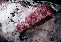 Коллекция Систематическая коллекция, №90216. Гексагональнопризматические кристаллы красновато-фиолетового корунда до 3.5см в зернистом агрегате олигоклаза в биотит-полевошпатовом гнейсе с альмандином. Длина экспоната 11.0 см.