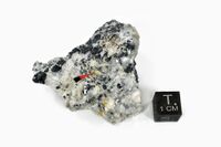 Коллекция Систематическая коллекция, №90279. Пластинчатые оранжевые кристалличкские зерна до 1.5мм в доломитовом карбонатите с магнетитом. Длина экспоната 4.5 см.Размер минерала 0.20 см.