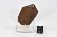 Коллекция Систематическая коллекция, №90320. Уплощенно-вытянутый коричневый расщепленный кристалл эосфорита частично замещенный эрнститом размером 5х3х1см, ограненный пинакоидом и призмой пояса hk0 (формируют комбинационную штриховку вдоль удлинения кристалла) и призмами {hkl}. Длина экспоната 5.0 см.Размер минерала 5.00 см.