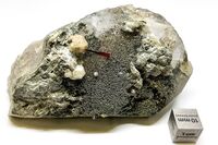 Коллекция Систематическая коллекция, №90353. Бесцветные изометричные псевдокубоктаэдрические кристаллы царегородцевита до 0,8см на гранях призмы кристалла кварца. С кристаллами анатаза и присыпками клинохлора Длина экспоната 12.0 см.Размер минерала 0.80 см.