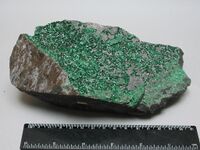 Коллекция Систематическая коллекция, №90483. Щетка ярко-зеленых кристаллов на хромите. Длина экспоната 17.0 см.