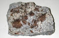Коллекция Систематическая коллекция, №90488. Радиально-лучистые сростки астрофиллита диаметром до 3см в альбит-микроклиновом щелочном пегматите. Длина экспоната 27.0 см.