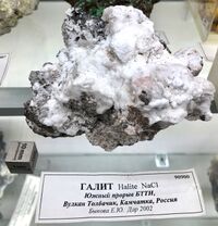 Коллекция Систематическая коллекция, №90900. Белые мелкокристаллическия корки галита, местами на поверхности переходящие в порошковатый агрегат, покрывающий шлак комковатой текстуры. Шлак, в свою очередь, пропитан галитом. Длина экспоната 11.0 см.