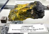 Коллекция Систематическая коллекция, №90901. Порошковатые налеты, корочки, иногда обнаруживающие тонкоигольчатое сложение и алмазный блеск. Окраска пятнистая от желтой до оранжевой. Длина экспоната 10 см.