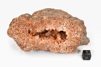 Коллекция Систематическая коллекция, №91148. Конкреция из соляных пластов, сложенная агрегатом хилгардита-1Tc, подкрашенного в красноватый цвет.окислами железа. В центре конкреции пустота инкрустированная кристаллами хильгардита размером до 1см. Длина экспоната 11.0 см.Размер минерала 1.00 см.
