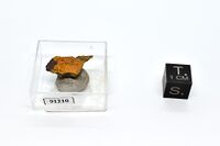 Коллекция Систематическая коллекция, №91210. Оранжево-желтые пластинчатые кристаллы размером до 2мм по трещинам во вмещающей породе. Вместе с рамоитом Оба минеральных вида - новые для музея. Длина экспоната 1.5 см.Размер минерала 0.20 см.