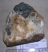 Коллекция Систематическая коллекция, №91236. Темные синевато-серые обособления размером до 5см, сложенные призматически-зернистым агрегатом магнезиоарфведсонита с включениями чешуек флогопита в мелкозернистом кальцитовом карбонатите с вкраплениями бурых кристаллов пирохлора размером до 0,6см. Длина экспоната 13.0 см.