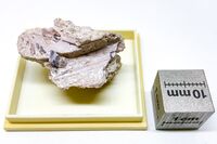 Коллекция Систематическая коллекция, №91289. Бледно-розовый до кремового мелкочешуйчатый агрегат, цеметрирующий мелкие кристаллы рубеллита, данбурита и лепидолита. Длина экспоната 3.0 см.