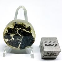 Коллекция Систематическая коллекция, №91427. Запресовка из эпоксидной смолы с кусочками мелкозернистого луяврита, в котором распределены мелкие зерна банальсита, определенные с помощью микрозонда.