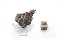 Коллекция Систематическая коллекция, №91456. Коричневый спутанноволокнистый агрегат токкоита с черным радиально-лучистым эгирином и с чароитом. Длина экспоната 4.0 см.Размер минерала 1.00 см.