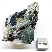 Коллекция Систематическая коллекция, №91472. Серовато-голубые волокнистые плотные скопления в натролите. Длина экспоната 4.5 см.Размер минерала 1.50 см.