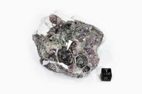 Коллекция Систематическая коллекция, №91654. Темно-вишневые изометричные зерна до 1.5см, окруженные коричневой каймой казаковита с анальцимом, уссингитом, крупными белыми пластинами натросилита, фосинаитом-(Ce), вуоннемитом, виллиомитом. Длина экспоната 9.0 см.Размер минерала 1.50 см.