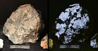 Коллекция Систематическая коллекция, №91683. Крупные (до 6см) желтоватые изометричные зерна шеелита в пироксеновом скарне. Яркая голубая люминесценция в коротком ультрафиолете. Длина экспоната 23.0 см.Размер минерала 6.00 см.