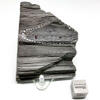 Коллекция Систематическая коллекция, №91701. Бесцветные прозрачные призматические кристаллы святославита с гексагональными пластинками дмиштейнбергита и (возможно) анортитом в трещинках в куске древесного угля. (Со слов Б.В. Чеснокова углефицированный кусок шпалы) Голотип. Внутри пунктирной линии сделанной краской. Длина экспоната 8.0 см.Размер минерала 0.08 см.