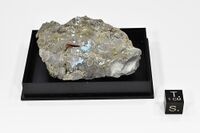 Коллекция Систематическая коллекция, №91733. Голубые радиально-лучистые сростки размером до 3мм на сером прокварцованном известняке. Длина экспоната 6.0 см.Размер минерала 0.30 см.