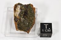 Коллекция Систематическая коллекция, №91738. Зеленоватые расщепленные кристаллы натродюфренита размером до 0.2мм с лейкофосфитом по трещине в кварцевом порфире. Длина экспоната 2.0 см.