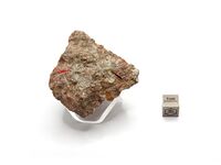 Коллекция Систематическая коллекция, №91761. Зеленовато-серые тонковолокнистые пучки и агрегаты протоманганоферроантофиллита размером до 1.5см в агрегате красного пироксмангита. Длина экспоната 7.0 см.Размер минерала 1.50 см.