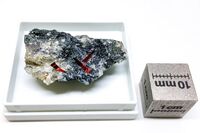Коллекция Систематическая коллекция, №91873. Темно-зеленые до черного игольчатые кристаллы в нефелиновом сиените. Длина экспоната 3.0 см.