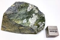 Коллекция Систематическая коллекция, №91913. Бесцветные тонкозернистые агрегаты суолунита, замещенные с поверхности пломбиеритом, кальцитом и тоберморитом в прожилках в измененном мервинит-шпинель- монтичеллитовом скарне. Белые мелкозернистые агрегаты в прожилке в основании образца - пломбиерит Длина экспоната 6.0 см.