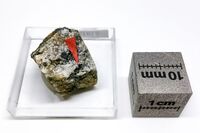 Коллекция Систематическая коллекция, №91916. Зеленые чешуйки ферроалюминоселадонита в эгирин-кварцевом метасоматите Длина экспоната 1.5 см.Размер минерала 0.20 см.