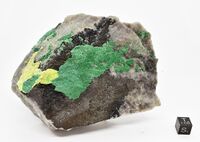 Коллекция Систематическая коллекция, №91944. Ярко-зеленые корки, сложенные пластинчатыми кристаллами торбернита размером до 2мм с канареечно-желтым отенитом на поверхности трещин в сливном кварце. Длина экспоната 10 см.
