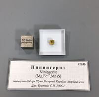Найден: метеорит Индарх Шуша, Нагорный Карабах, Азербайджан.Минералы-спутники: Камасит, Клиноэнстатит, Троилит.