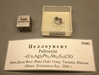 Коллекция Систематическая коллекция, №92082. Серебристые с металлическим блеском зерна хеллимондита с пиритом в кальците Длина экспоната 0.5 см.