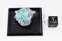 Коллекция Систематическая коллекция, №92450. Интенсивно-голубые плоские расщепленные кристаллы ивонита размером до 1мм и их сростки вместе с зеленоватыми кристаллами пущаровскита и бледно-голубыми кристаллами геминита на висмуте. Длина экспоната 2.5 см.