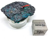 Коллекция Систематическая коллекция, №92475. Черный зернистый агрегат парамелаконита с хризоколлой Длина экспоната 4.0 см.