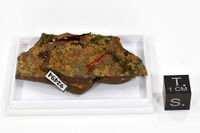 Коллекция Систематическая коллекция, №92494. Радиальные сростки темно-зеленых шестоватых кристаллов парасимплезита размером до 8мм с симплезитом и кеттигитом. Длина экспоната 5.0 см.