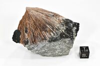 Коллекция Систематическая коллекция, №92516. Коричневый лучистый титанит с зеленым нефелином и черным аннитом. Длина экспоната 7.0 см.Размер минерала 4.00 см.