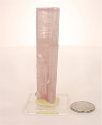 Литиевый турмалин, наиболее разнообразный в цветовом отношении получил название эльбаит в честь итальянского острова Эльба. На фото изображен субпараллельный сросток бледно-розового эльбаита из Афганистана в срастании с кристаллами литиевой слюды лепидолита.