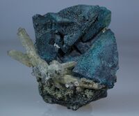 Коллекция Систематическая коллекция, №92549. Сросток (возможно двойниковый) темно-синих тетраэдрических кристаллов халькопирита размером до 2см с кварцем. Длина экспоната 4.0 см.Размер минерала 2.00 см.