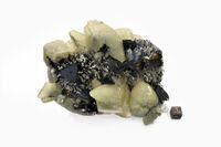 Коллекция Систематическая коллекция, №92551. Темно-синие тетраэдрические кристаллы халькопирита размером до 2см со скаленоэдрами кальцита нарастающие на друзу мелких кристаллов кварца. Длина экспоната 11.0 см.Размер минерала 2.00 см.