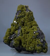 Коллекция Систематическая коллекция, №92562. Зеленые игольчатые кристаллы эпидота длиной до 5мм нарастающие на друзу блестящих октаэдрических кристаллов магнетита размером до 5мм. Длина экспоната 14.0 см.Размер минерала 0.50 см.