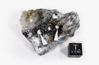 Коллекция Систематическая коллекция, №92581. Белые радиально-лучистые сростки предполагаемого нового минерала подлесноита BaCa2(CO3)2F2, покрытые друзами его же бесцветных прозрачных призматических кристаллов. На щетках натролита и ильменита. Люминесцирует в коротковолновом УФ диапазоне розово-оранжевым (призматические кристаллы) и голубовато-сиреневым (сферолиты на сколе) Длина экспоната 4.5 см.Размер минерала 0.04 см.